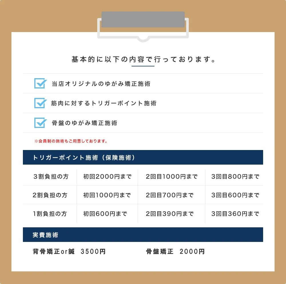当院では、背骨と骨盤のゆがみを整え、更に深い部分の筋肉の施術「トリガーポイント施術」をすることで根本的な痛みの原因を改善に導きます。